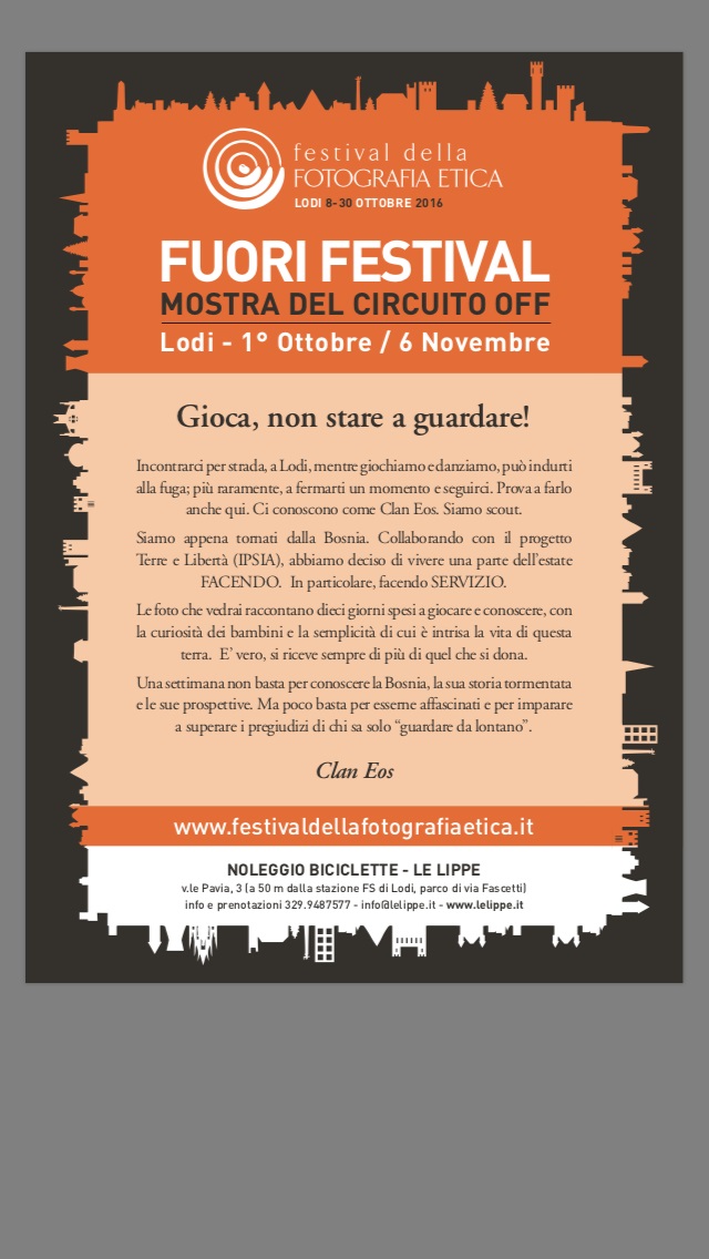 Il 2 ottobre a Lodi, il ragazzi del Clan scout Clan Eos, racconteranno la propria esperienza in Bosnia Erzegovina con il progetto di volontariato internazionale di IPSIA, Terre e Libertà, attraverso la mostra fotografica Gioca, non stare a guardare! . La mostra che sarà ospitata nell'ambito del Festival della Fotografia Etica che si svolge a Lodi dal 1° ottobre al 6 novembre 2016.